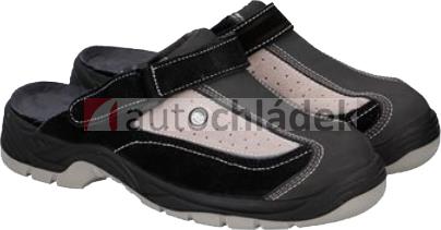Truckerské sandály šedo-černé, semišové s kovovou špičkou a přeskou přes patu.