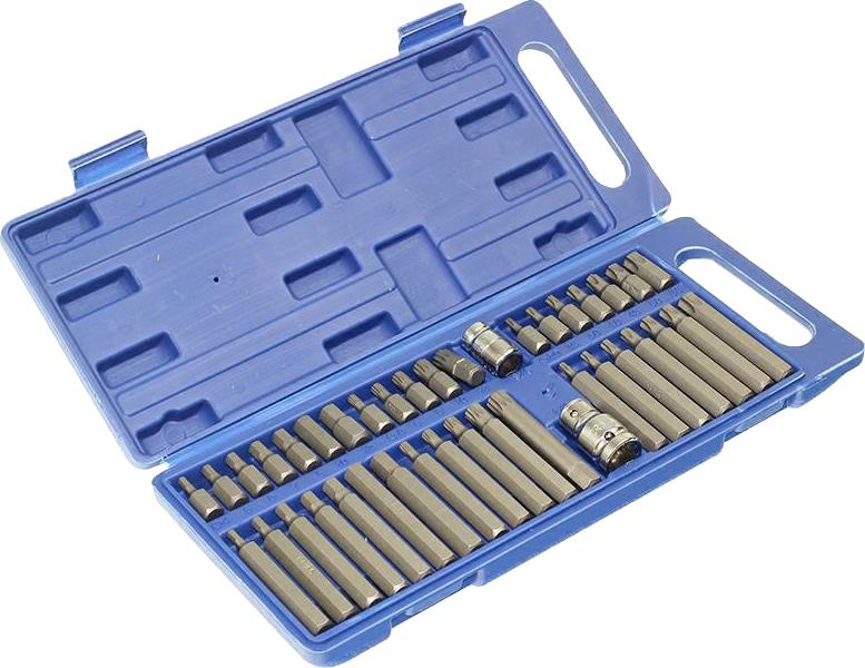 Sada 40 nejpoužívanějších bitů s profily H - IMBUS, M - XZN, SPLINE (tisícihran) a T - Torx, která obsahuje adaptéry k připojení bitů na řáčny 1/2" a 3/8".