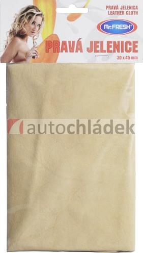Pravá kůže z jednoho kusu (nesešívaná), nezanechává šmouhy a výtečně saje vodu. Určeno k čištění skel, zrcátek, na lakované, chromované a plastové části, k osušení kapek vody.