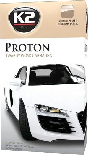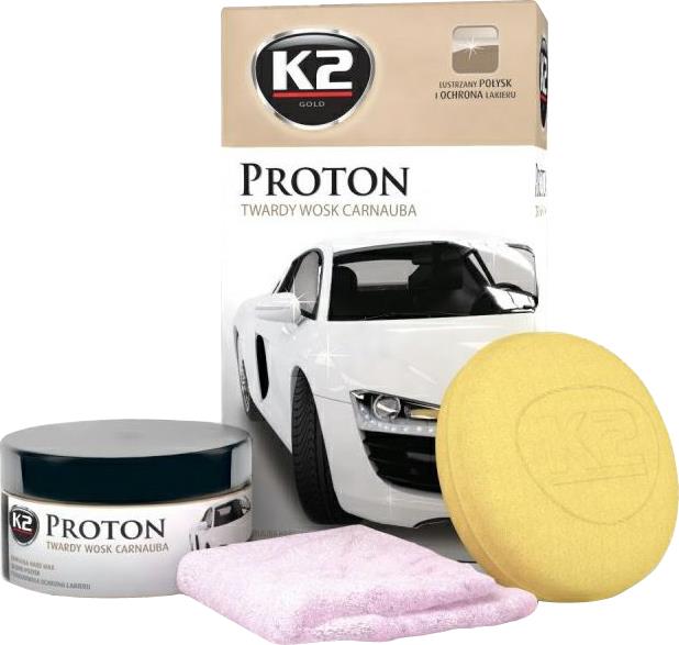 K2 Proton je vysoce účinný a efektivní vosk, který je založený na nejtvrdším známém přírodním vosku karnauba. Zajišťuje zrcadlový lesk a zesiluje barvu laku. Snadně se aplikuje a leští. Poskytuje dlouhodobou ochranu dokonce až po tucet, nebo i více mycích cyklů. Po nanesení se nátěr stává zcela hladkým, což umožňuje kapkám vody odtéct z laku. Chrání proti oxidaci a UV záření.