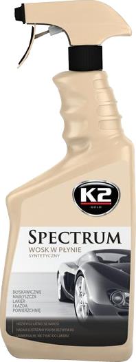 K2 Spectrum je unikátní Quick Detailer a rovněž syntetický vosk (2 v 1), který byl vytvořen na základě nejmodernějších technologií. Umožňuje navoskování bez jakékoliv námahy, díky čemuž získává vysoký lesk. Stačí pouze nanést pomocí rozprašovače a povrch setřít. Spectrum se snadno leští a nezanechává bílé stopy. Zaručuje dokonalé použití pro všechny druhy laků. Je možné ho nanášet i na rozehřátý povrch.