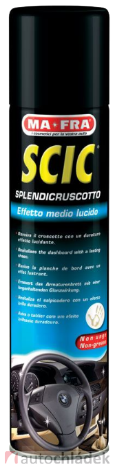 MA-FRA SCIC Blue je přípravek na vnitřní plasty, svým čistícím a hygienizujícím složením získal inovativní charakteristiky. Díky speciální anistatické složce zabraňuje po dlouhou dobu od aplikace usazování prachu na ošetřeném povrchu. Se Scicem získá ošetřovaný povrch původní vzhled, brilantní, čistý a chráněný.