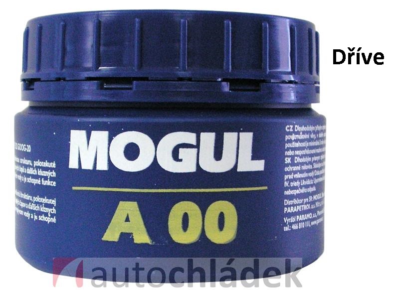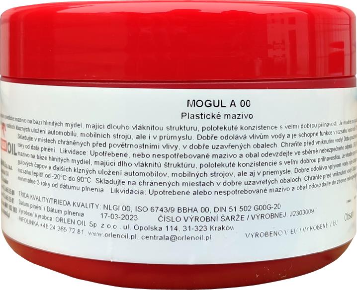 Plastické mazivo A00 je vyrobené z olejovitých základů o vysoké viskozitě zpevněných hlinitým mýdlem, má dlouhovláknitou strukturu, vysokou tažnost a odolnost proti vodě. Plastické mazivo MOGUL A00 je určené převážně pro mazání svislých a kulových čepů a dalších kluzných uložení v automobilu. Teplotní rozsah -20 až 90 °C.