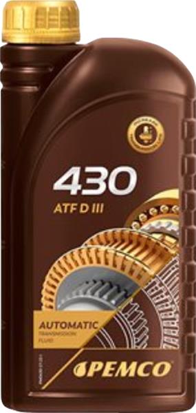 Celoroční převodová kapalina na syntetické bázi pro automatické převodovky (ATF), hydraulické měniče, hydraulické posilovače řízení, automobilové hydraulické spojky a další hydraulická zařízení, včetně těch, která pracují v těžkých podmínkách v nákladních a terénních vozidlech. Barva: červená PEMCO 430 ATF DIII zajišťuje bezchybný chod automatické převodovky, zaručuje minimální opotřebení, dlouhou životnost převodovek a úsporu paliva. Byl vyvinut na základě požadavků stanovených skupinami GM a Ford. Doporučuje se pro automatické převodovky osobních a užitkových vozidel vyžadující kvalitní olej ATF typu Dexron-III H/G/F nebo Dexron-II E nebo FORD MERCON V. Je určen pro většinu automatických převodovek pro General Motors, Ford Company a další značky vyrobené do roku 2006.