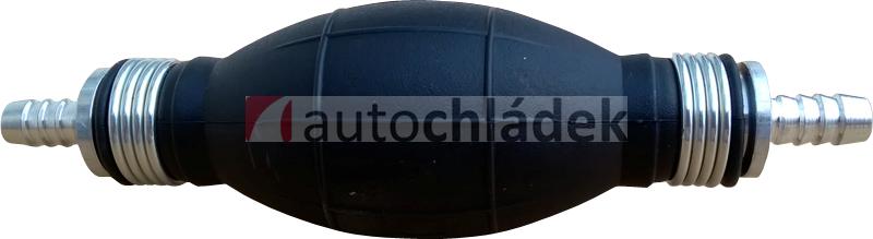 Ruční pumpa paliva a ostatních kapalin, gumový balónek se zpětným ventilem, kovové koncovky o průměru 10 mm, celková délka 15 cm.