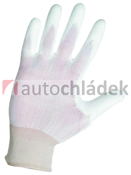 Bezešvý úplet z jemného nylonu, pružná manžeta, dlaň a prsty pokryté tenkou vrstvou polyuretanu, bílé.