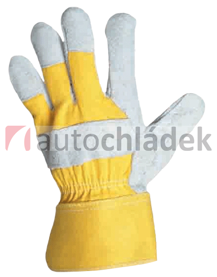 Dlaň z šedé štípenky, hřbet a ztužená manžeta ze žluté bavlněné tkaniny, podšívka ve dlani.