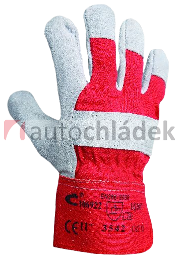 Dlaň z šedé hovězí štípenky, hřbet a vyztužená manžeta z červené bavlněné tkaniny, podšívka ve dlani