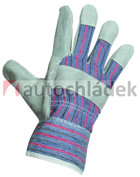 Dlaň z šedé hovězí štípenky, hřbet a manžeta z pruhované bavlněné tkaniny, podšívka ve dlani.