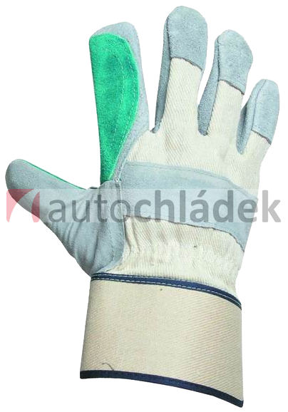Zdvojená dlaň z šedé a zelené hovězí štípenky, hřbet a tuhá manžeta z bílé bavlněné tkaniny, podšívka ve dlani.