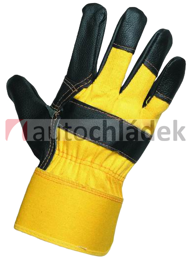 Dlaň z tmavé jednobarevné lícové nábytkové hověziny, hřbet a tuhá manžeta ze žluté bavlněné tkaniny, podšívka ve dlani.