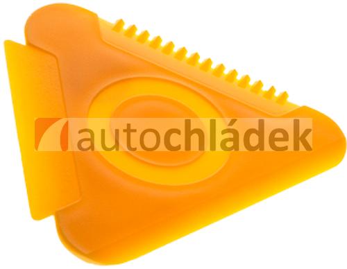 Jednoduchá škrabka trojúhelníkového tvaru, každá strana má specifickou úpravu pro snadné odstranění námrazy.